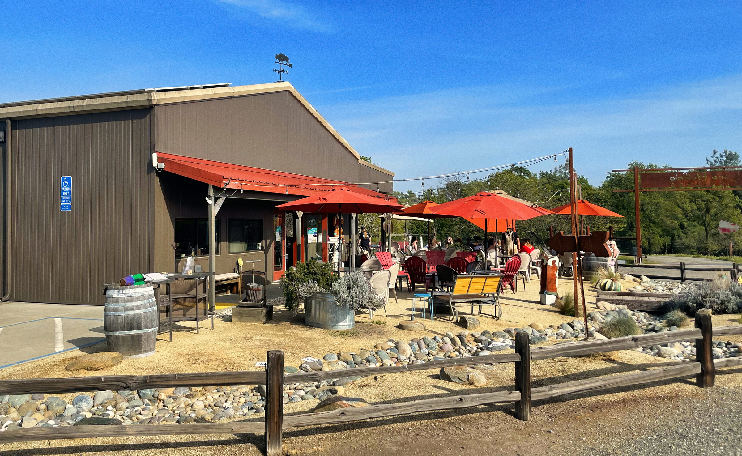 A little off the beaten path and a short drive down a rugged oak-lined dirt road, from the already off the beaten path of Wise Road, you’ll find the inviting bright red awning and umbrellas of Lone Buffalo Vineyards. Inside, the tasting room is suggestive of a wood paneled adventure club. Step up to the beautiful natural wood tasting bar and sample some traditional favorites and a few unusual surprises, all delicious.